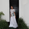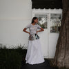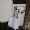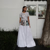 Skirt with triangular panels in white with an overskirt with triangular printed panels with photos that our creative director took in Panama city, Panama. The PUERTAS skirt is hand crafted in Peru and made with ethically sourced materials from local partners.